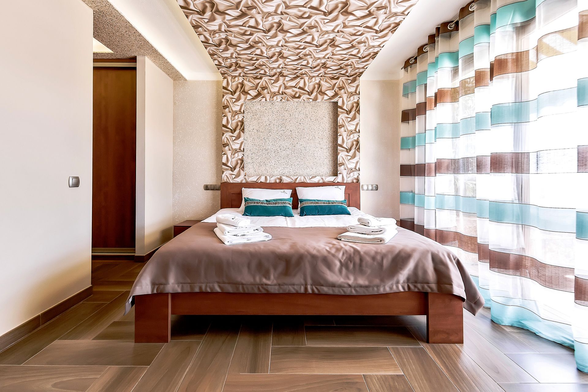 - Elegancka i nowoczesna sypialnia urządzona z dbałością o szczegóły, idealna na wypoczynek. Centralnym punktem jest wygodne łóżko z drewnianą ramą, otoczone stylowymi dekoracjami ściennymi i sufitem o unikalnym wzorze. Podłoga wyłożona płytkami imitującymi drewno nadaje wnętrzu ciepły, przytulny charakter. Duże okna z lekkimi, wzorzystymi firanami wpuszczają mnóstwo naturalnego światła. Przy łóżku znajdują się praktyczne stoliki nocne, a całość dopełniają subtelne dodatki i artystyczne akcenty, tworząc atmosferę komfortu i relaksu..