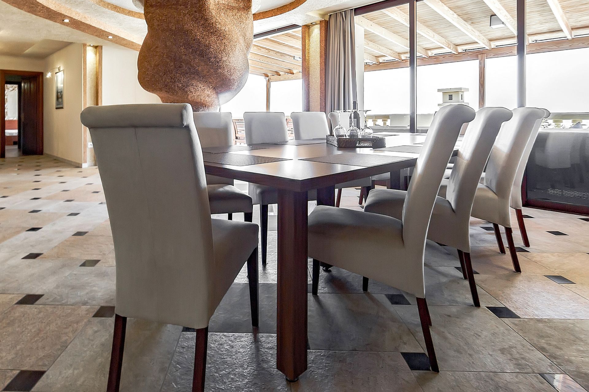 - Jadalnia z dużym stołem i wygodnymi krzesłami w jasnych kolorach zaprasza do wspólnych posiłków i spędzania czasu z bliskimi. Centralnym elementem przestrzeni jest dekoracyjna kolumna oraz designerski sufit, które nadają wnętrzu wyjątkowego charakteru.