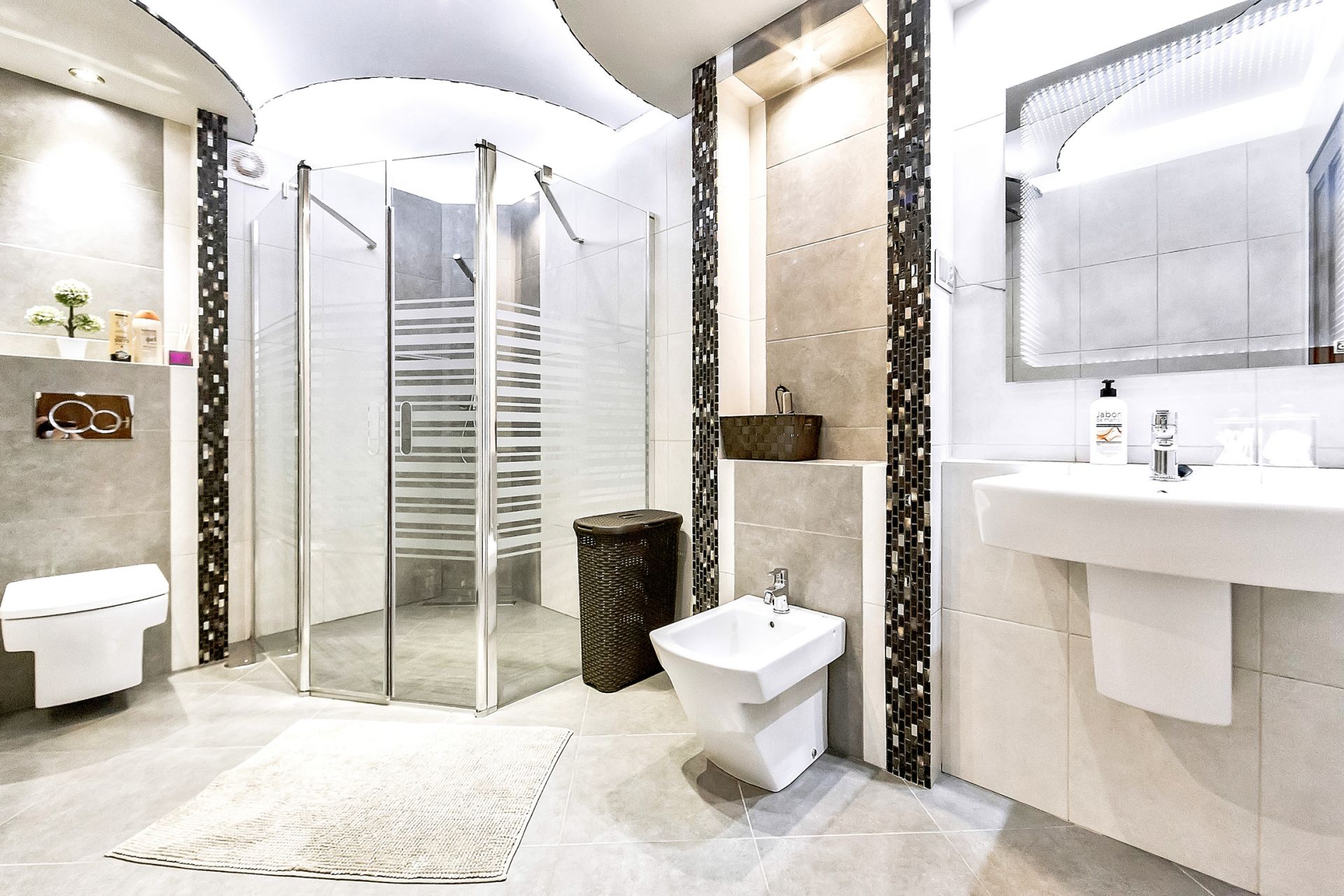 - Nowoczesna i przestronna łazienka zaprojektowana z myślą o komforcie i funkcjonalności. Wyposażona w elegancką kabinę prysznicową z przejrzystymi drzwiami, tworzy przestrzeń idealną do codziennej pielęgnacji. Jasne płytki w odcieniach szarości i bieli podkreślają minimalistyczny charakter wnętrza, a dekoracyjne mozaiki dodają subtelnego uroku.