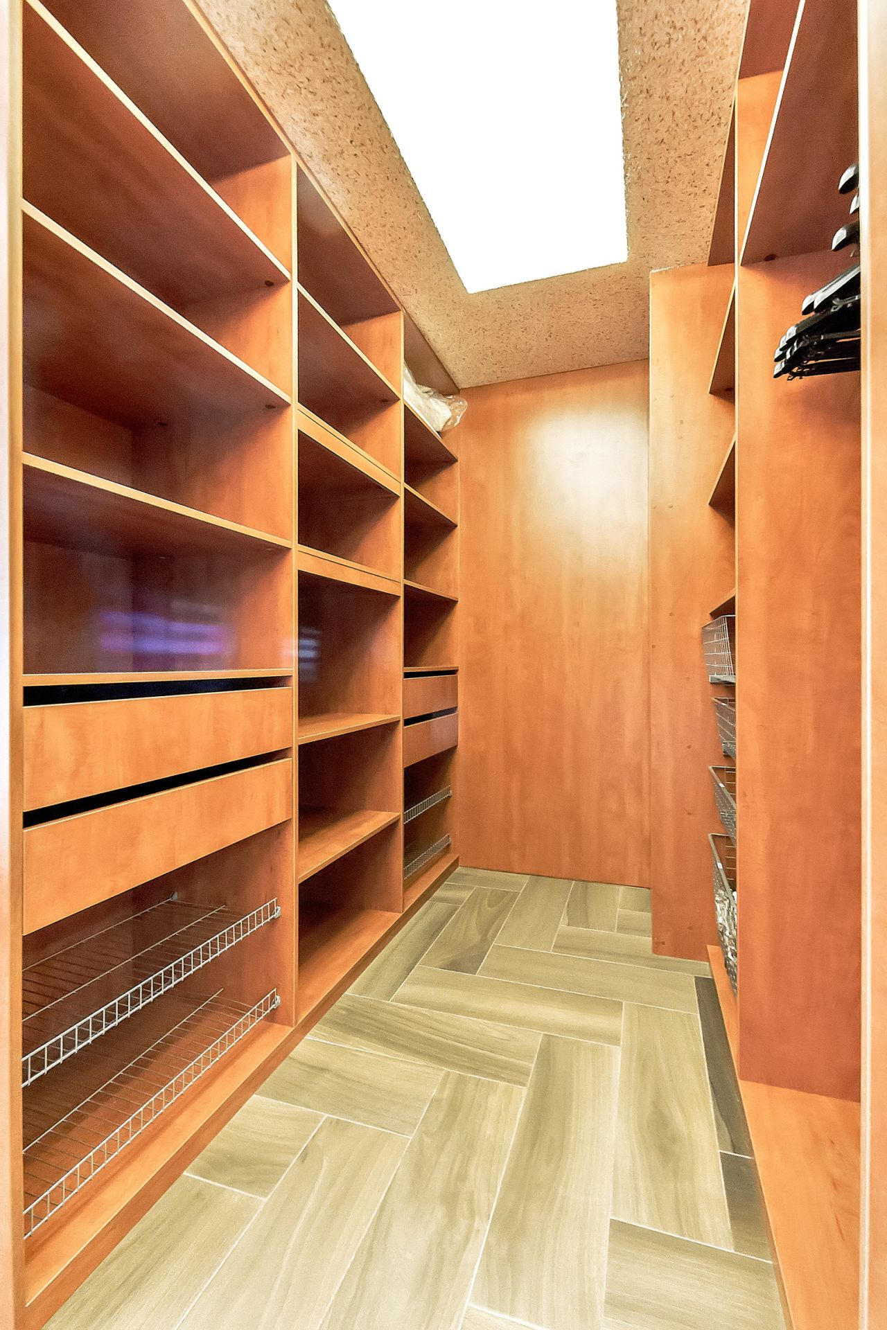- Przestronna i funkcjonalna garderoba stanowi idealne uzupełnienie komfortowego apartamentu. Pomieszczenie zostało wyposażone w liczne półki, szuflady i wieszaki, oferując dużo miejsca na przechowywanie ubrań i akcesoriów. Dzięki zastosowaniu drewnianych elementów w ciepłym odcieniu, wnętrze jest nie tylko praktyczne, ale również estetyczne. Garderoba posiada łatwy dostęp z sypialni, co dodatkowo zwiększa wygodę użytkowania. Jasne oświetlenie sufitowe podkreśla przestronność pomieszczenia i ułatwia organizację. To idealne rozwiązanie dla osób ceniących wygodę i porządek w swoim otoczeniu