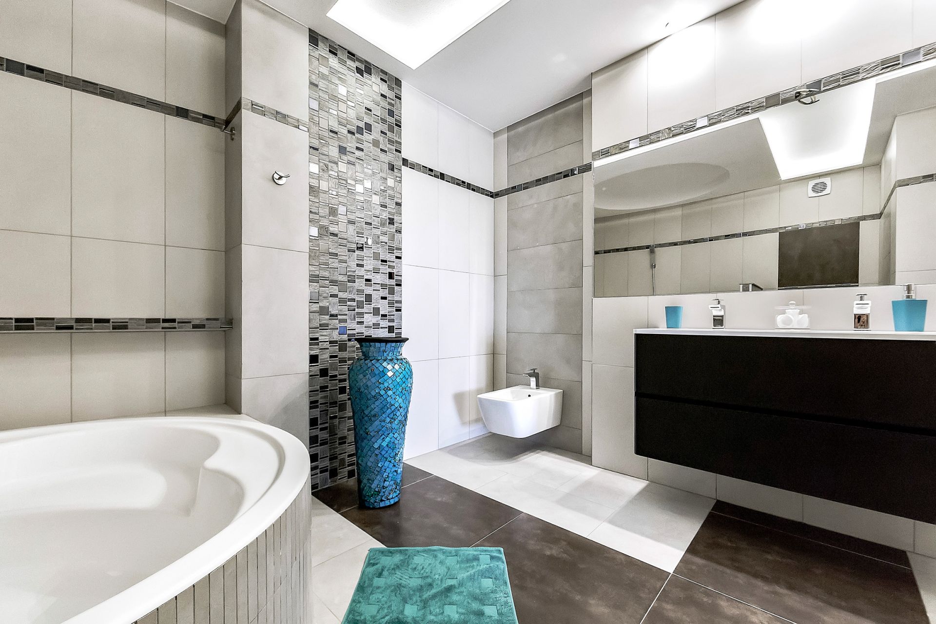 - Nowoczesna i przestronna łazienka utrzymana w neutralnych odcieniach beżu, szarości i brązu, z eleganckimi akcentami turkusowymi, oferuje połączenie funkcjonalności i stylu. W centralnej części znajduje się narożna wanna w zabudowie, a całość dopełniają podwieszana toaleta oraz pojemna szafka z dużym lustrem. Ściany zdobi dekoracyjna mozaika z metalicznym połyskiem, nadając wnętrzu nowoczesnego charakteru, a waza i dodatki w kolorze turkusowym ożywiają przestrzeń. Dyskretne oświetlenie LED i dobrze zaprojektowany układ gwarantują komfort użytkowania, czyniąc to miejsce idealnym zarówno do codziennego użytku, jak i relaksu.